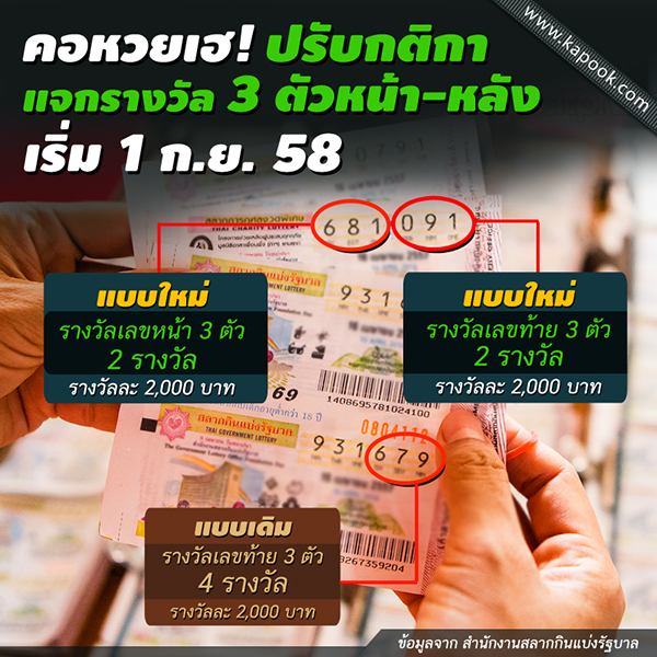 สำหรับการปรับเปลี่ยนรางวัลเลขท้าย 3 ตัวนั้น จะปรับลดรางวัลเลขท้าย 3 ตัว จากการเสี่ยง 4 ครั้ง เป็น 2 ครั้ง จำนวน 2,000 รางวัล รางวัลละ 2,000 บาท และปรับเพิ่มรางวัลเลขหน้า 3 ตัว การเสี่ยง 2 ครั้ง จำนวน 2,000 รางวัล รางวัลละ 2,000 บาท โดยจะเริ่มดำเนินการตั้งแต่ งวดประจำวันที่ 1 กันยายน 2558 เป็นต้นไป