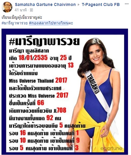 แม้การประกวด Miss Universe 2017 จะจบลงไปแล้ว แต่ควันหลงของการประกวดก็ยังคงไม่หายไปไหน เพราะปีนี้ มารีญา นางงามจากประเทศไทย มีความสวยครบเครื่อง และเข้าไปใกล้กับมงกุฎมากจริง ๆ