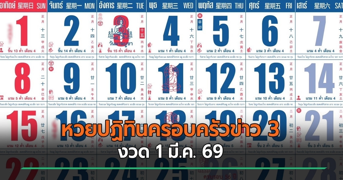 กลับมาอีกครั้งกับเลขเด็ดจากหวยปฏิทินครอบครัวข่าว 3 งวดวันที่ 1 มี.ค. 69 คอหวยไม่พลาดส่องตัวเลขเด่นประจำเดือน ทั้งเลขวันสำคัญและตัวเลขน่าสนใจในปฏิทิน